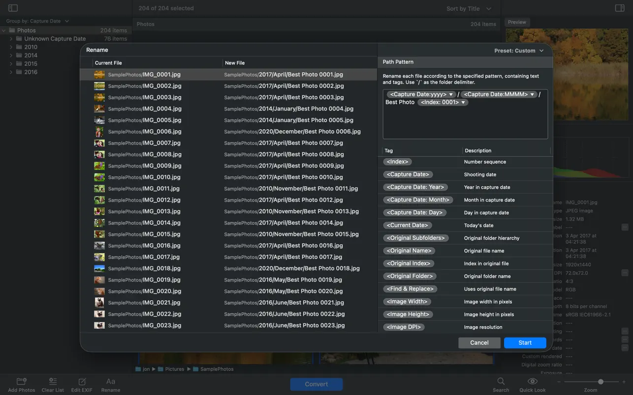 в “pro” способом - с помощью текста и тегов: индекс, дату съемки, оригинальное название, ширина изображения и т.д. Кроме того, вы можете переименовать фотографии во время копирования в другую папку без какого-либо преобразования.
