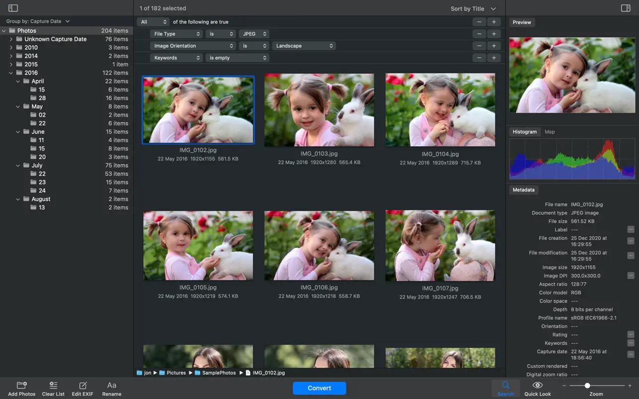 У приложения есть связка особенностей удобного просмотра и поиска мультикритериев фотографий в Браузере. У Браузера есть 3 группы: Информация Изображения - показывает подробную информацию об отобранной фотографии; Группы - разделяют фотографии на группы/подгруппы, основанные на выбранные критерии, например, датам съемки; Поиск - дает Вам возможность искать фотографии по различным критериям.