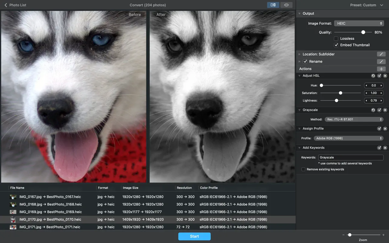 Описание: PhotoMill позволяет конвертировать большое количество изображений в наиболее популярные форматы, давать файлам осмысленные имена, наносить водяные знаки в виде текста и изображения, корректировать фотографии (яркость/насыщенность/экспозиция/масштаб серого/и т.д.), подгонять под геометрию (масштабирование/обрезка/обрезка/и т.д.), удалять приватные метаданные, добавлять свои авторские права и т.д. Кроме того, PhotoMill - это отличный пакетный редактор метаданных, переименователь и браузер фотографий. Особенности: Фотобраузер