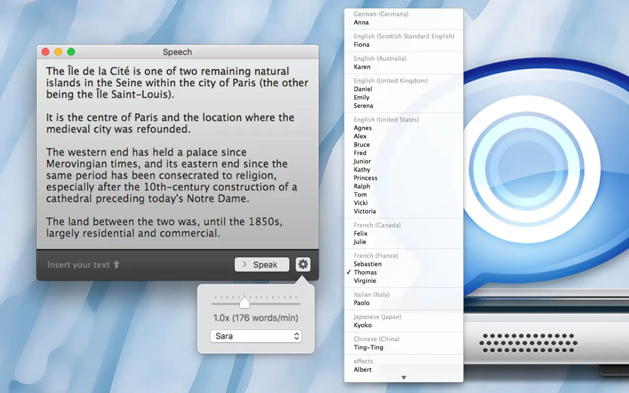 Доступно множество языков: выберите один из более чем 40 голосов и языков. Перетащите или вставьте текст в Speech и начните читать. В любой момент можно изменить голос и темп речи. Щелкните на слове, чтобы воспроизвести его с определенного места текста.