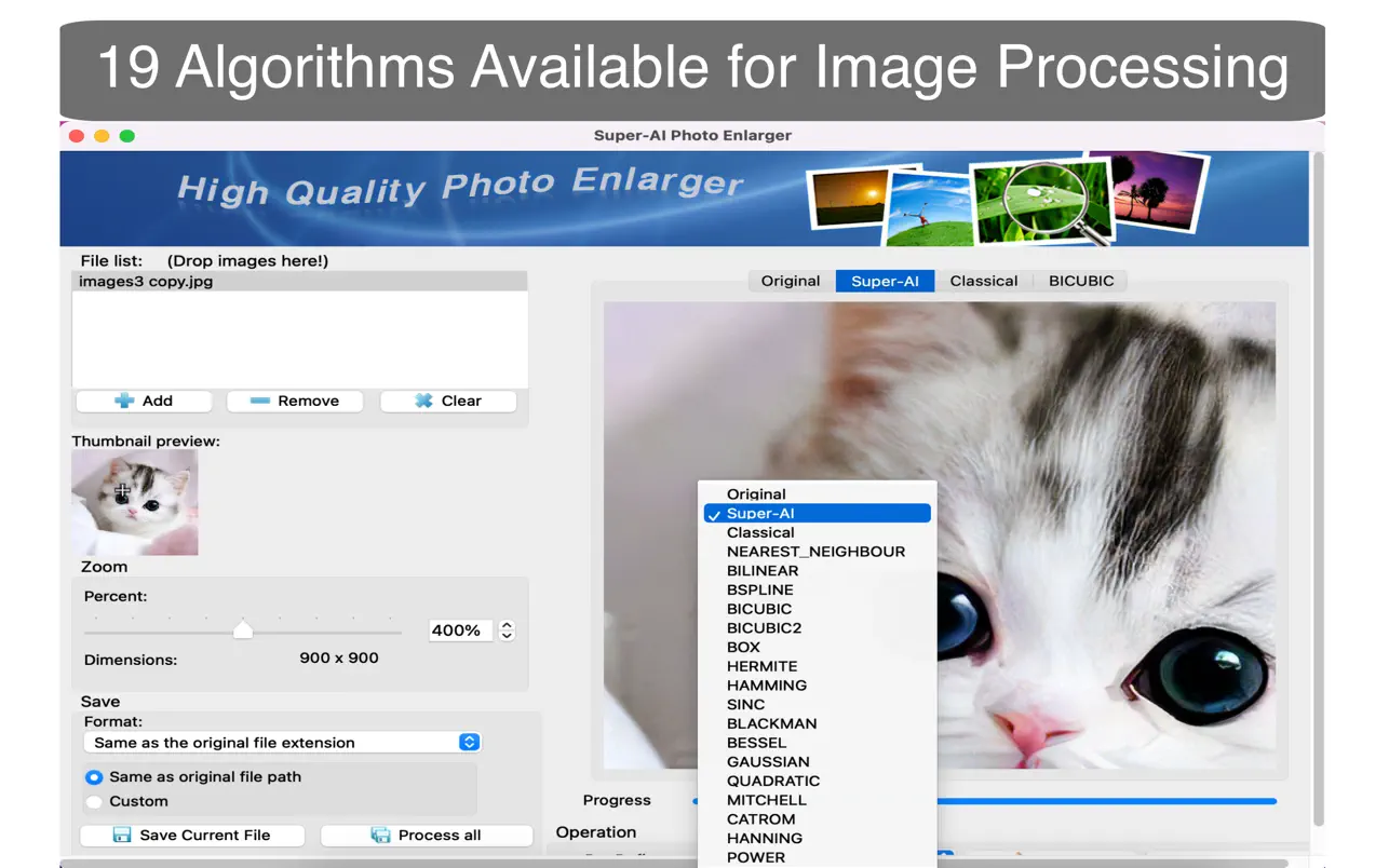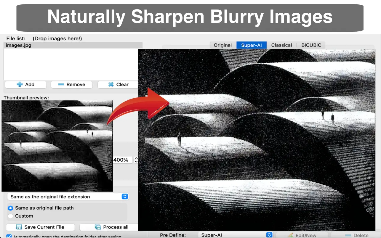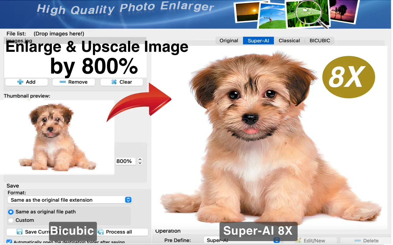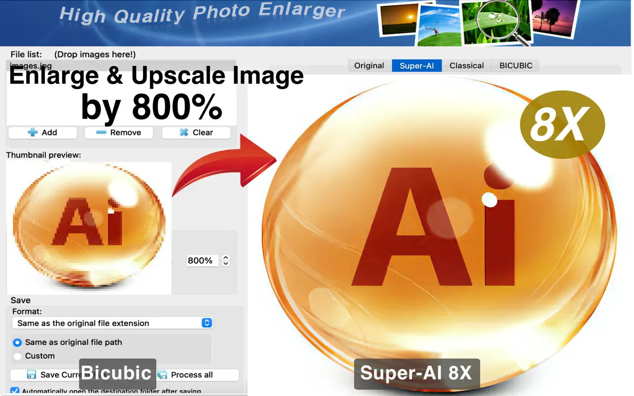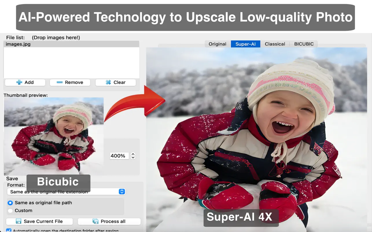 - Одновременная обработка по трем заданным алгоритмам: Super-AI, Classical, Bicubic. Вы можете выбрать любой из них, который лучше соответствует вашим пожеланиям.