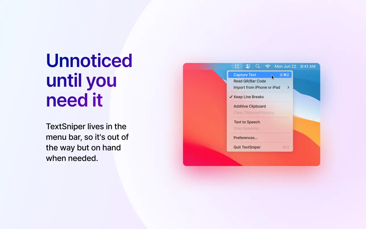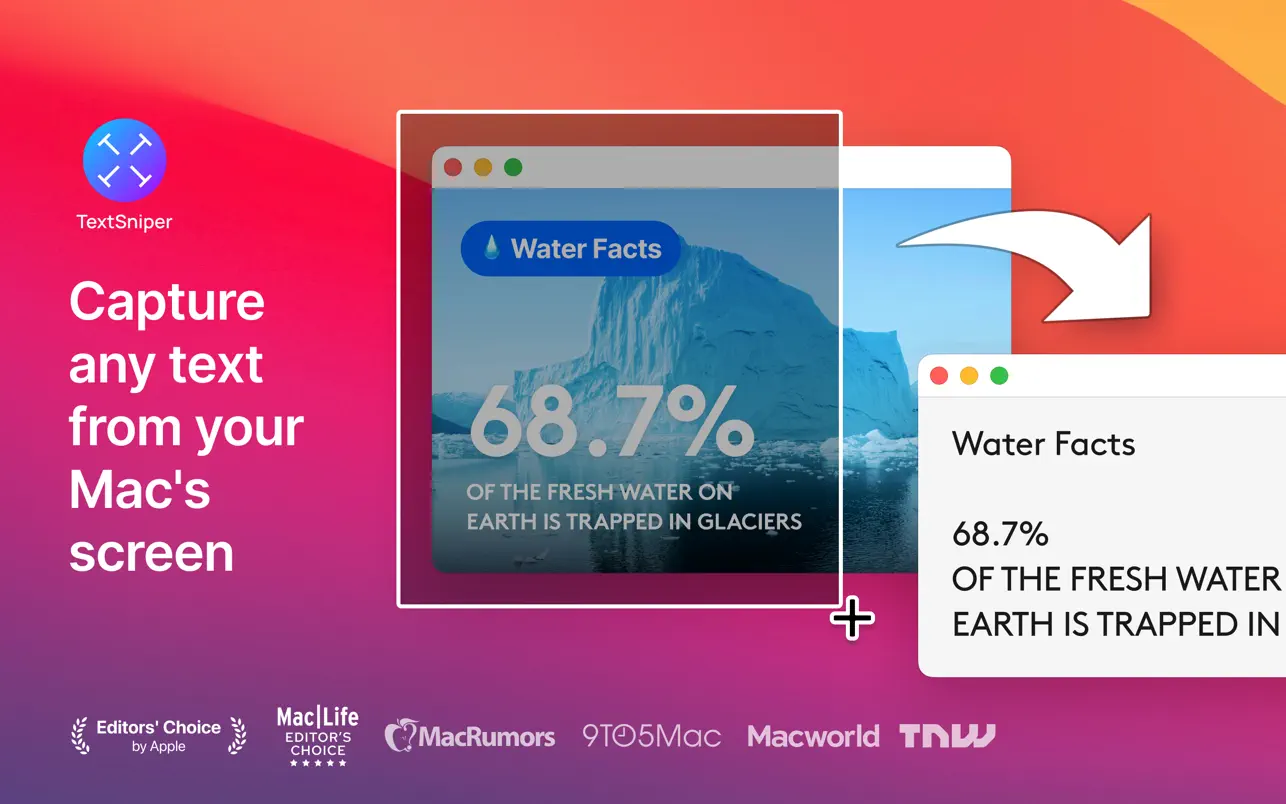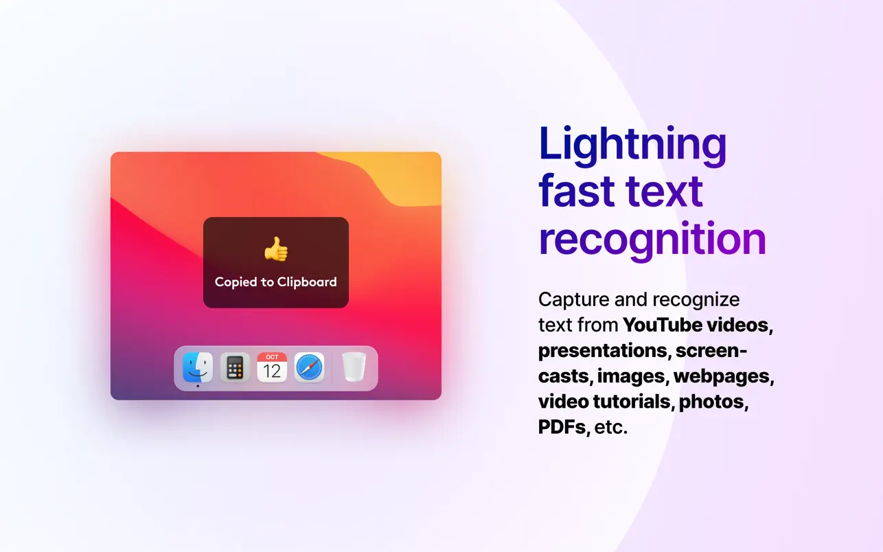 Описание: TextSniper - это простой и удобный инструмент распознавания текста для Mac. Она извлекает любой текст из выделенной части экрана и превращает его в редактируемый текст. Программа легко распознает текст из графики, цифровых документов и видео. Вы можете попросить TextSniper произнести распознанный текст, когда вам это потребуется. Работает молниеносно и не требует подключения к Интернету. Скриншоты:-