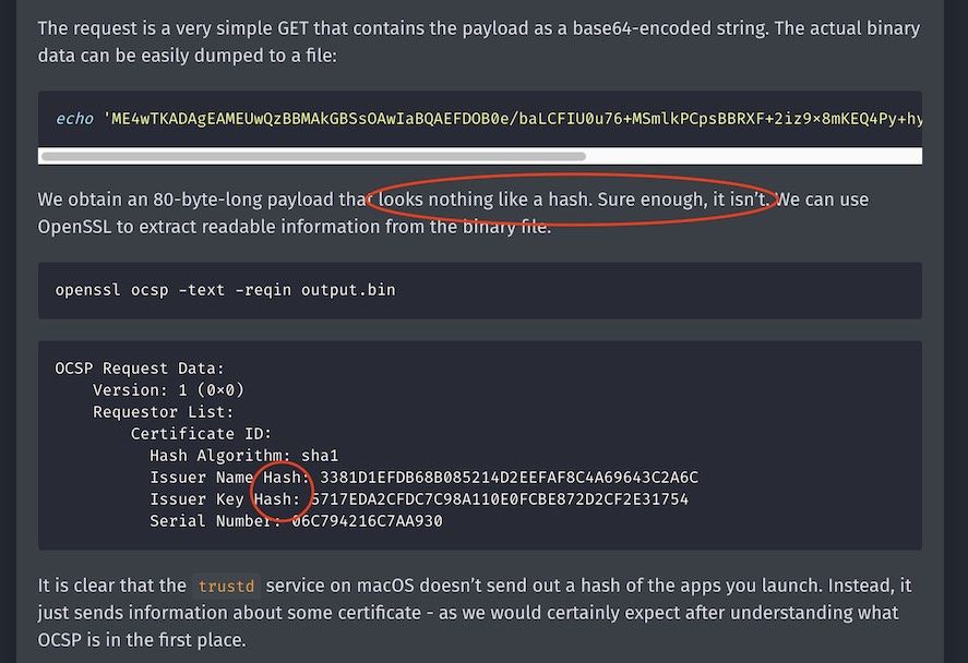 Оп! Он также утверждает, что "macOS действительно отправляет некоторую неясную информацию о сертификате разработчика этих приложений". На самом деле она вовсе и не неясная: это общеизвестный уникальный идентификатор разработчика приложения (который почти для всех приложений является общедоступным, поскольку большинство разработчиков публикуют только одно приложение). Это наглядно иллюстрирует опасность доверять любому эксперту, у которого за кликбейтными [url=https://en.wikipedia.org/wiki/Betteridge's_law_of_headlines]заголовками Беттериджа[/url] скрывается технический бред. Убедитесь, что вы всегда все перепроверяете, и всегда, всегда, задавайтесь вопросом: "Каковы факты?". То, что отправлено, действительно является хешем, действительно является уникальны идентификатором для большинства приложений и действительно отправляется в Apple в реальном времени в незашифрованном виде с вашим IP-адресом. Я упростил приведенное выше объяснение, чтобы не вдаваться в подробности о OCSP, x509 и PKI. Я умышленно не утверждал, что это был хэш содержимого двоичного файла приложения. TL;DR: Этот пост был, есть и будет максимально достоверным. А кликбейты пусть и дальше остаются кликбейтами. Хорошая новость заключается в том, что Apple (предположительно в ответ на эту страницу) только сегодня публично обязалась: 1. Удалять логи IP-адресов; 2. Шифровать обмен данными между macOS и Apple, чтобы предотвратить утечку конфиденциальности; 3. Предоставить пользователям возможность отключить онлайн-проверки, которые позволяют узнать, какие приложения вы открываете и когда. Это обновление находится в самом низу этой страницы, под заголовком с заглавной буквы "Защита конфиденциальности". Цитата из обновления Apple от 16 ноября: