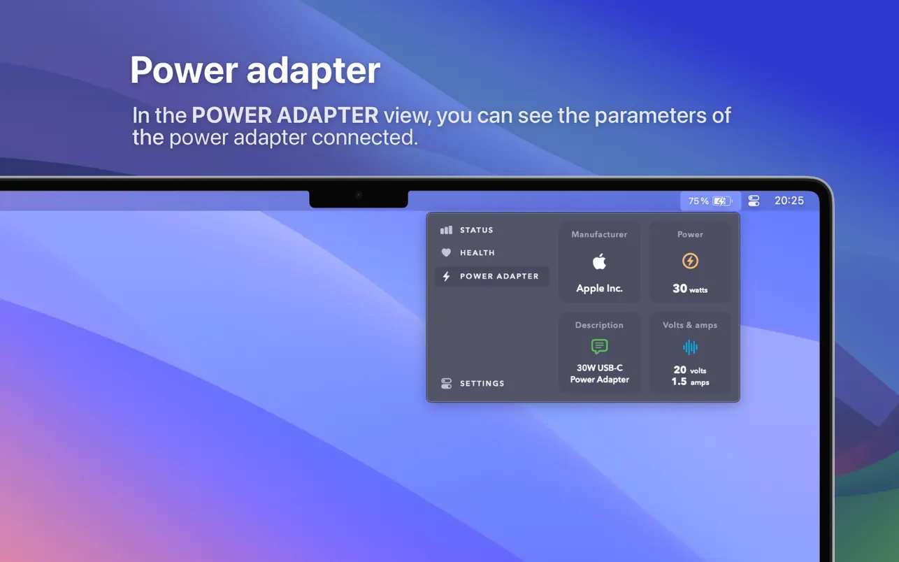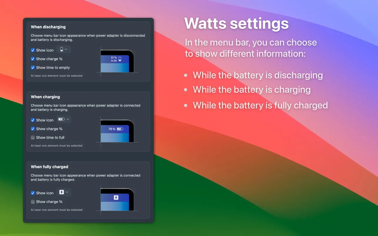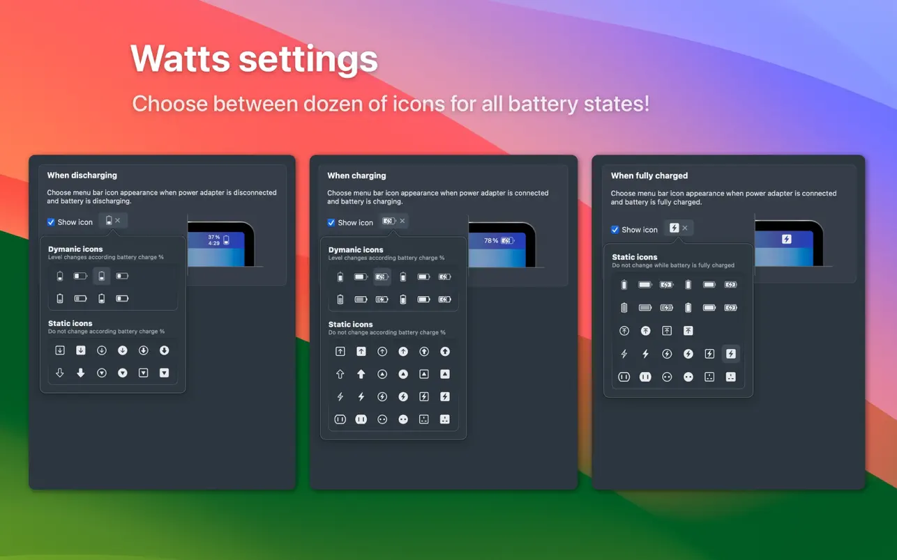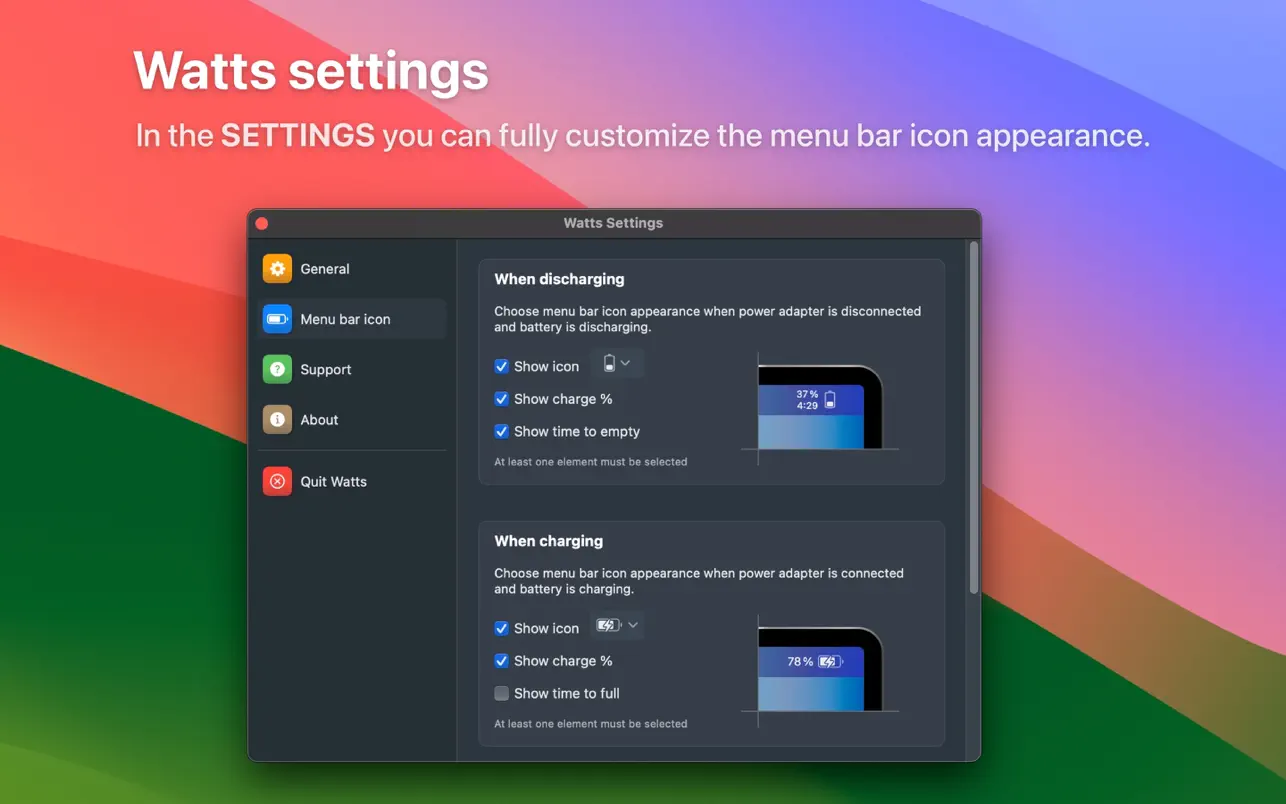 Информация о подключенном адаптере питания (марка, мощность, напряжение и ток и т. д.) Кроме того, в настройках Watts вы можете полностью настроить внешний вид значка панели меню: