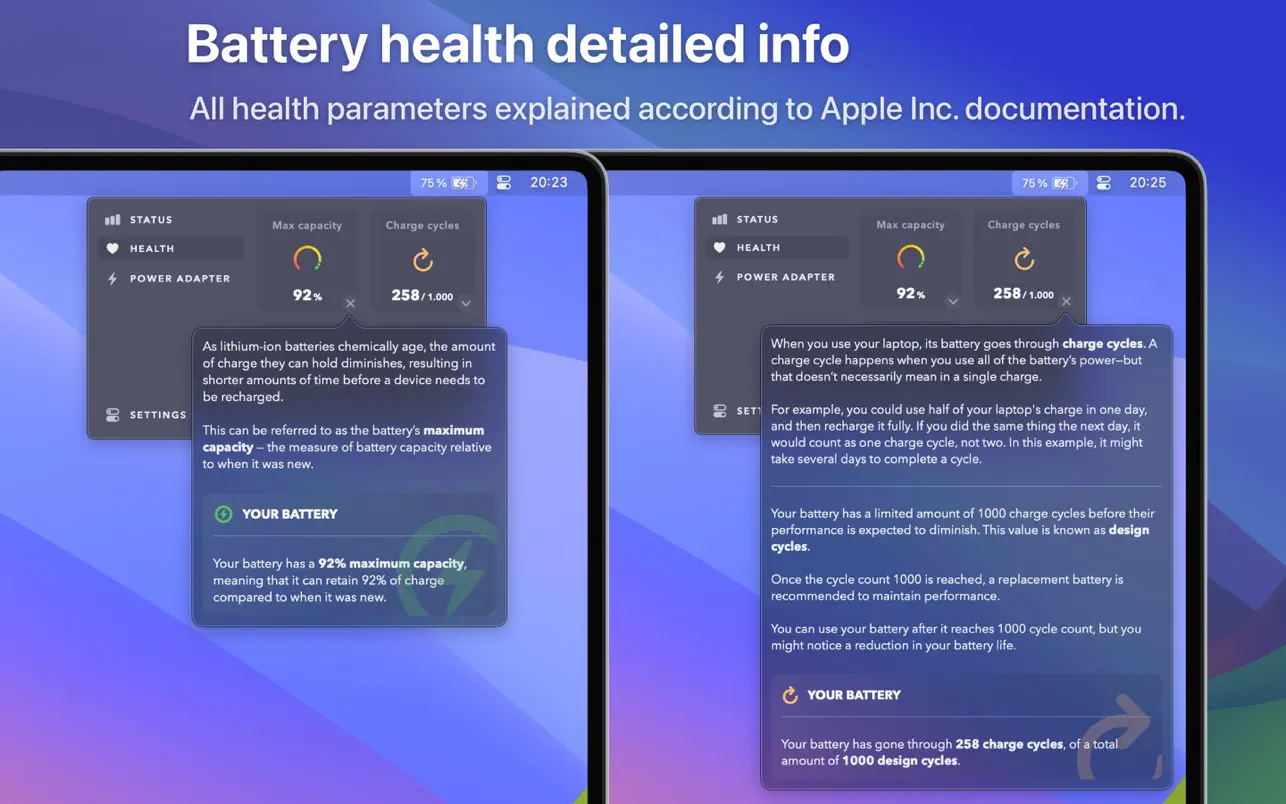 Параметры состояния вашей батареи (циклы зарядки, максимум, емкость и т. д.) очень просто объясняются
