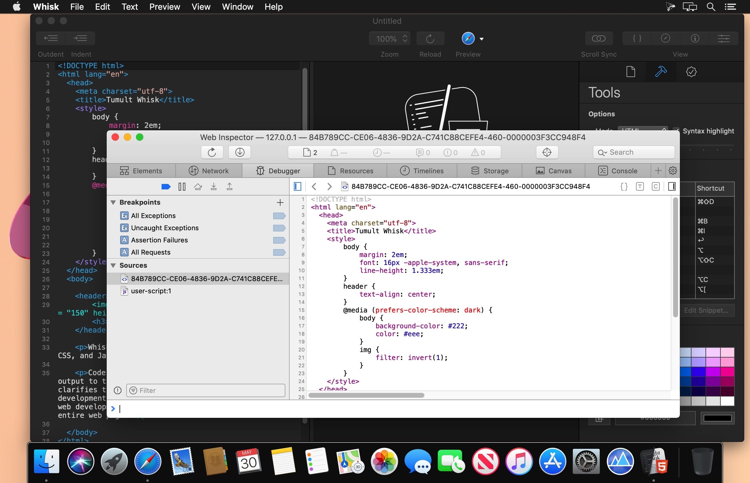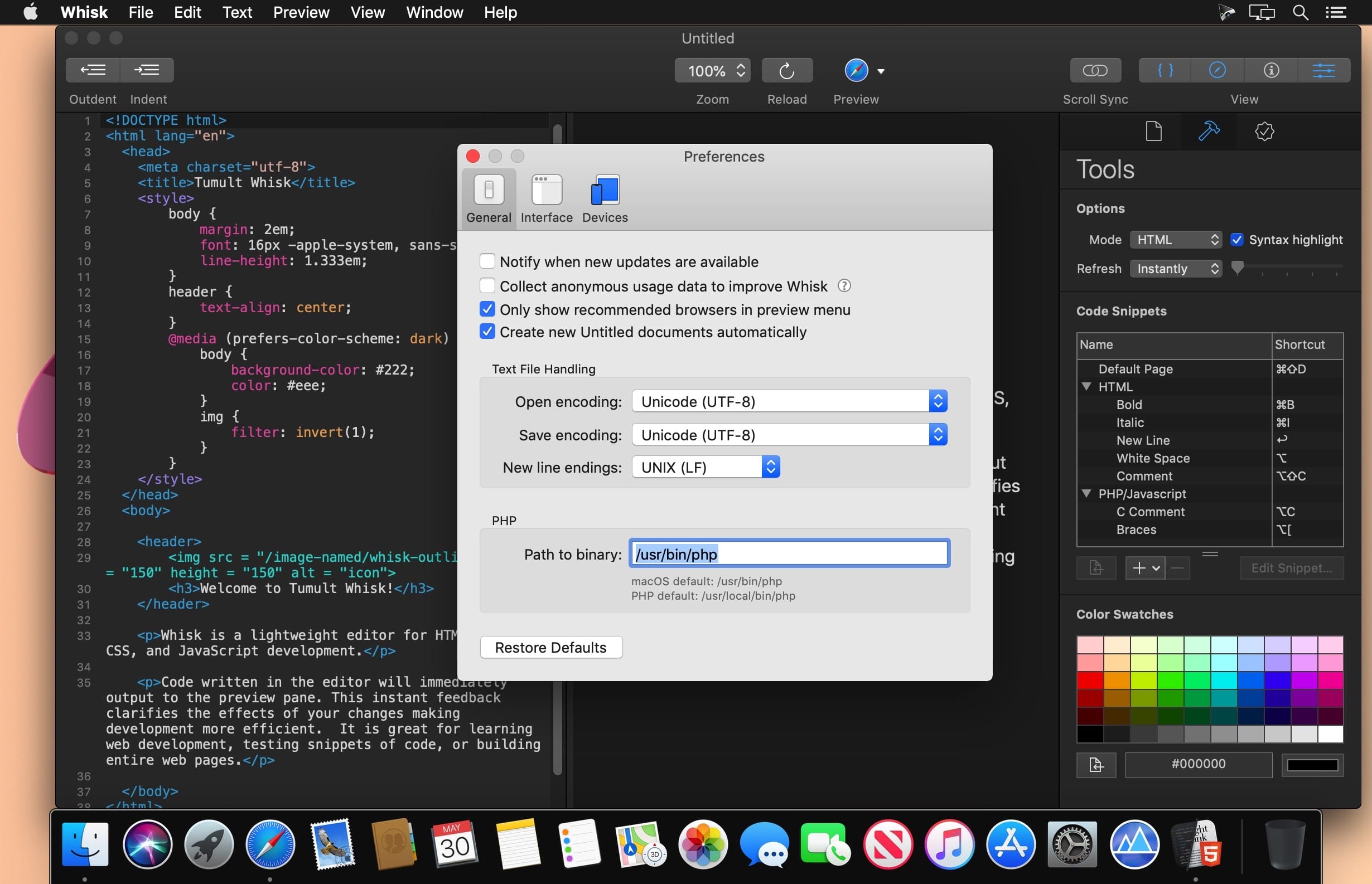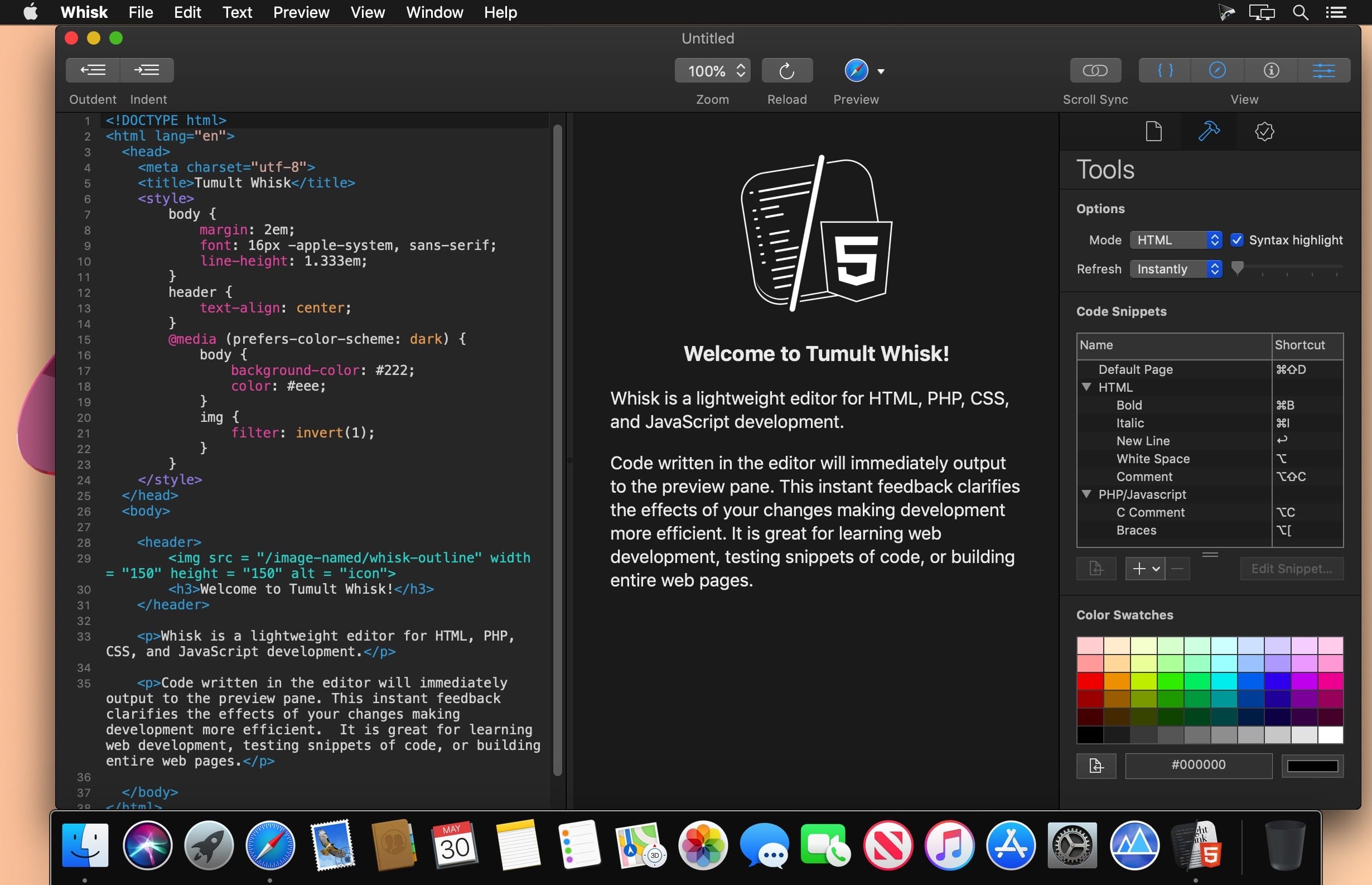 • Apple M1 chip Описание: Whisk - это легкий редактор HTML и PHP с предварительным просмотром в реальном времени, который обновляется по мере ввода текста. Whisk является важным приложением в вашем наборе инструментов для программирования HTML, PHP, CSS и JavaScript. Он отлично подходит для изучения веб-разработки, тестирования фрагментов кода или создания целых веб-страниц. Интегрированная панель предварительного просмотра Whisk отображает веб-страницу в режиме реального времени по мере ввода. Whisk прерывает утомительный цикл написания HTML, сохранения файла, перезагрузки и просмотра страницы в браузере. Объединение фазы написания с фазой просмотра проясняет последствия ваших изменений и ускоряет весь процесс создания веб-страницы. Проверка на основе W3C подчеркнет все ошибки. Он использует тот же механизм рендеринга, что и в Safari, поэтому он не только соответствует стандартам, но и очень быстр. Скриншоты:-