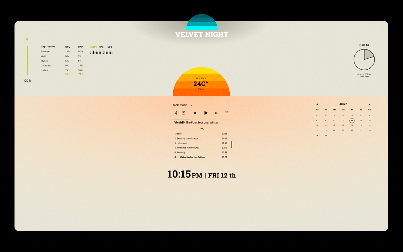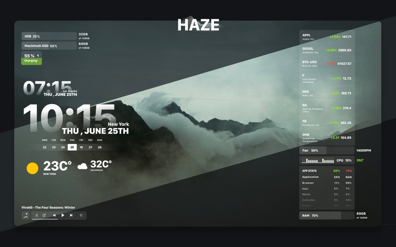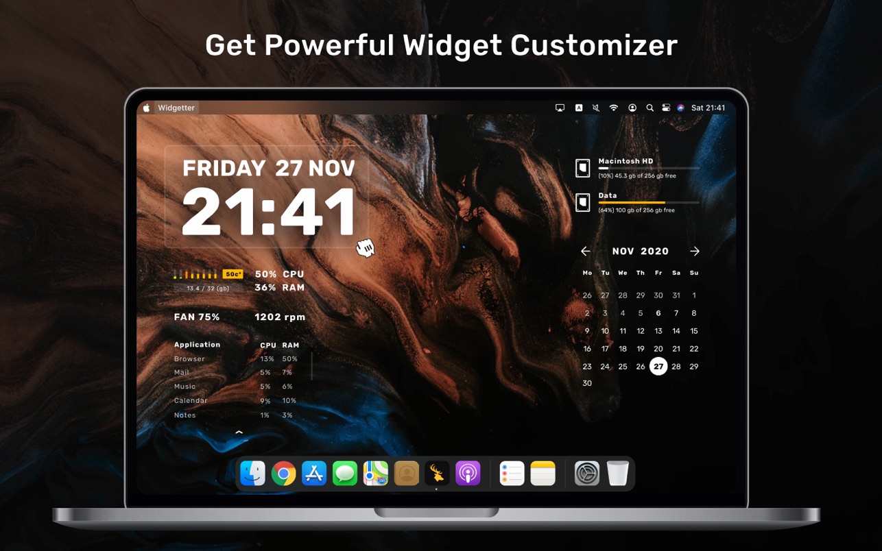 Начните создавать индивидуальный домашний экран, чтобы все ключевые данные и основные функции всегда были доступны с первого взгляда. Приложение оптимизирует элементы управления, собирая основную информацию о производительности вашего Mac, а также наиболее важные команды и объединяя их в виджеты. Вы можете выбрать любую комбинацию из них для отображения на экране, сгруппировать и расположить их оптимальным образом. Для наиболее важных из них обязательно используйте функцию «всегда наверху», чтобы они отображались в каждом открытом окне. Выберите понравившуюся заставку из огромной коллекции обоев 4k и 5k.