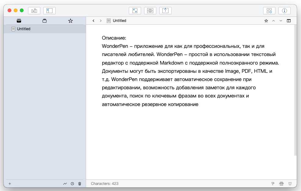 Описание: WonderPen - приложение для как для профессиональных, так и для писателей любителей. WonderPen - простой в использовании текстовый редактор с поддержкой Markdown с поддержкой полноэкранного режима. Документы могут быть экспортированы в качестве Image, PDF, HTML и т.д. WonderPen поддерживает автоматическое сохранение при редактировании, возможность добавления заметок для каждого документа, поиск по ключевым фразам во всех документах и автоматическое резервное копирование.
