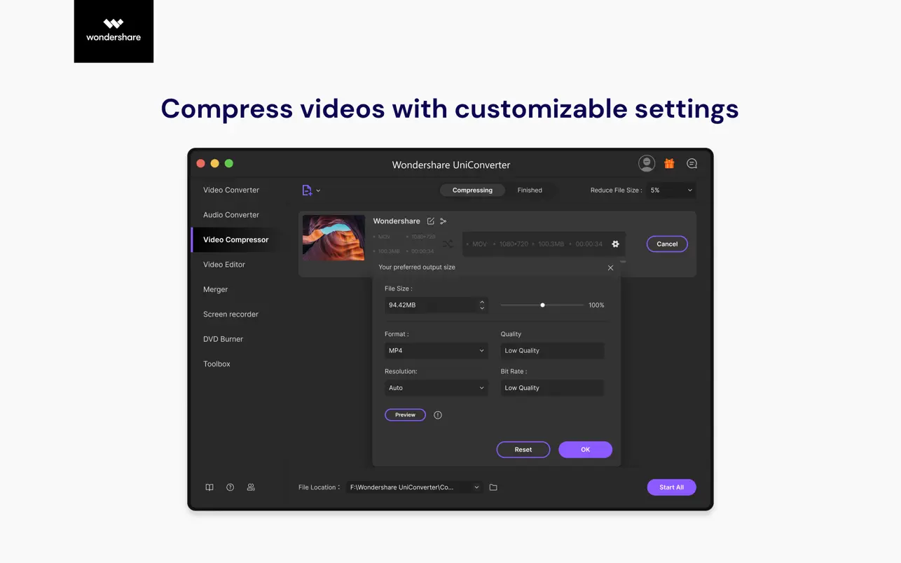Отрегулируйте разрешение видео, битрейт и выходной формат, чтобы уменьшить размер видео Mac.