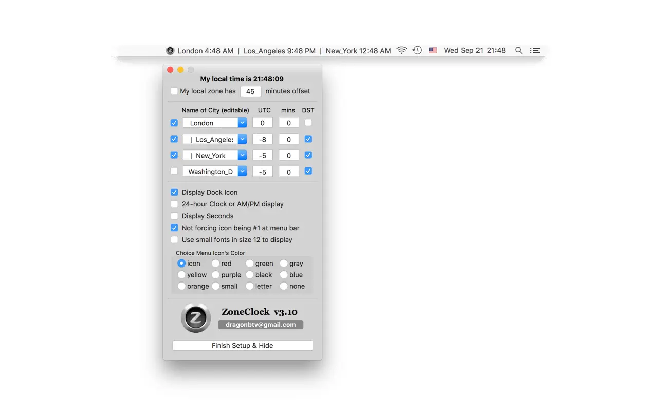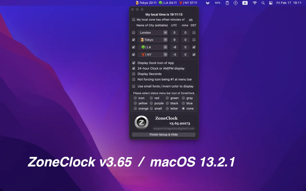 Описание: ZoneClock - это миниатюрные, но мощные часы с мировым временем. Он удобно размещается в верхней строке системного меню, поэтому его можно увидеть и не заметить. Простой в использовании и на 100% настраиваемый ZoneClock идеально подходит для всех. ZoneClock может одновременно отображать время до четырех различных часовых поясов.