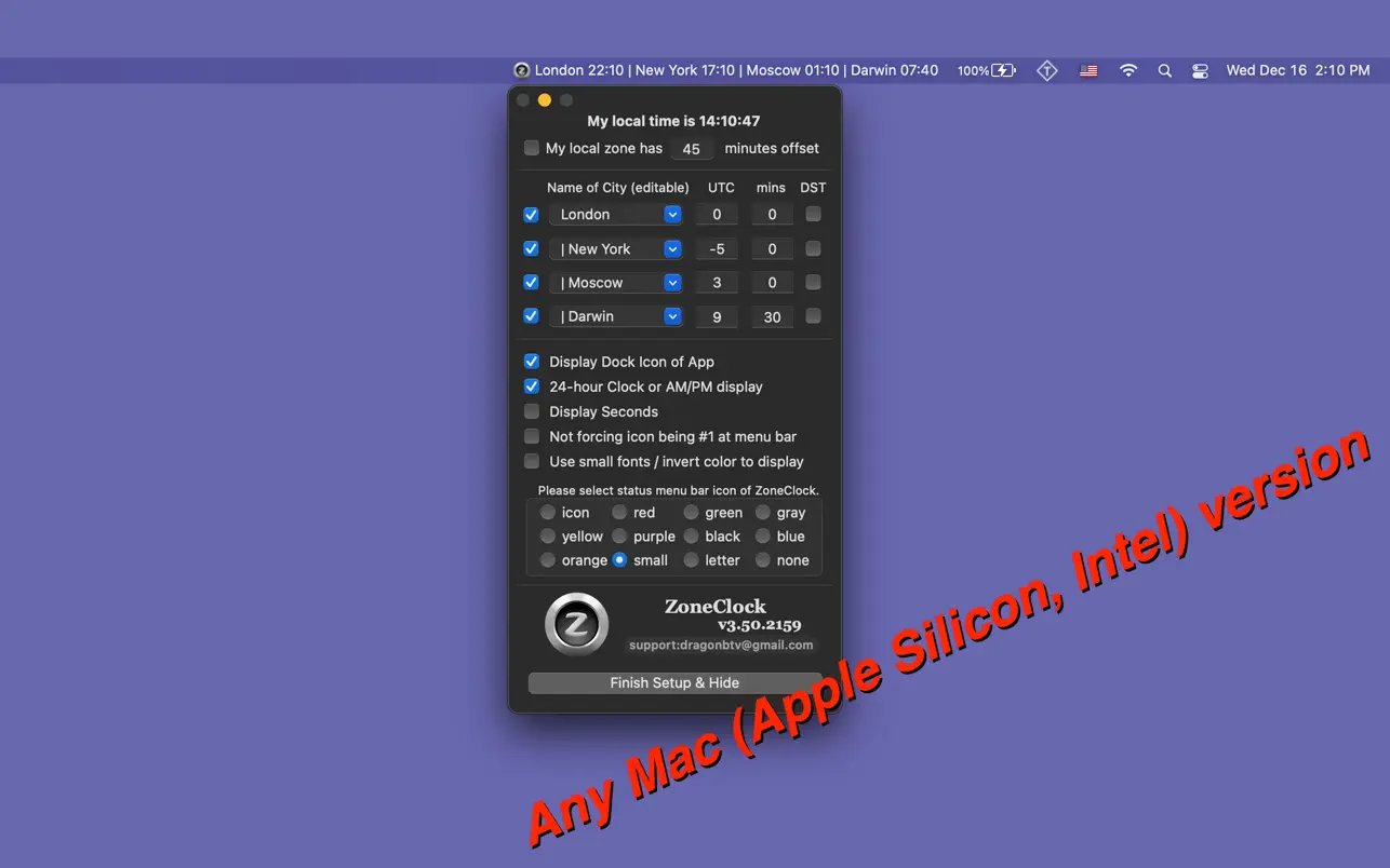 ZoneClock Год выпуска: 2023 Версия: 3.65 Разработчик: Jiulong Zhao Платформа: Intel/Apple Silicon Universal Язык интерфейса: английский Таблэтка: Программа пролечена (не требует введения данных/вводим любые данные) [ см. обозначения ] Системные требования: